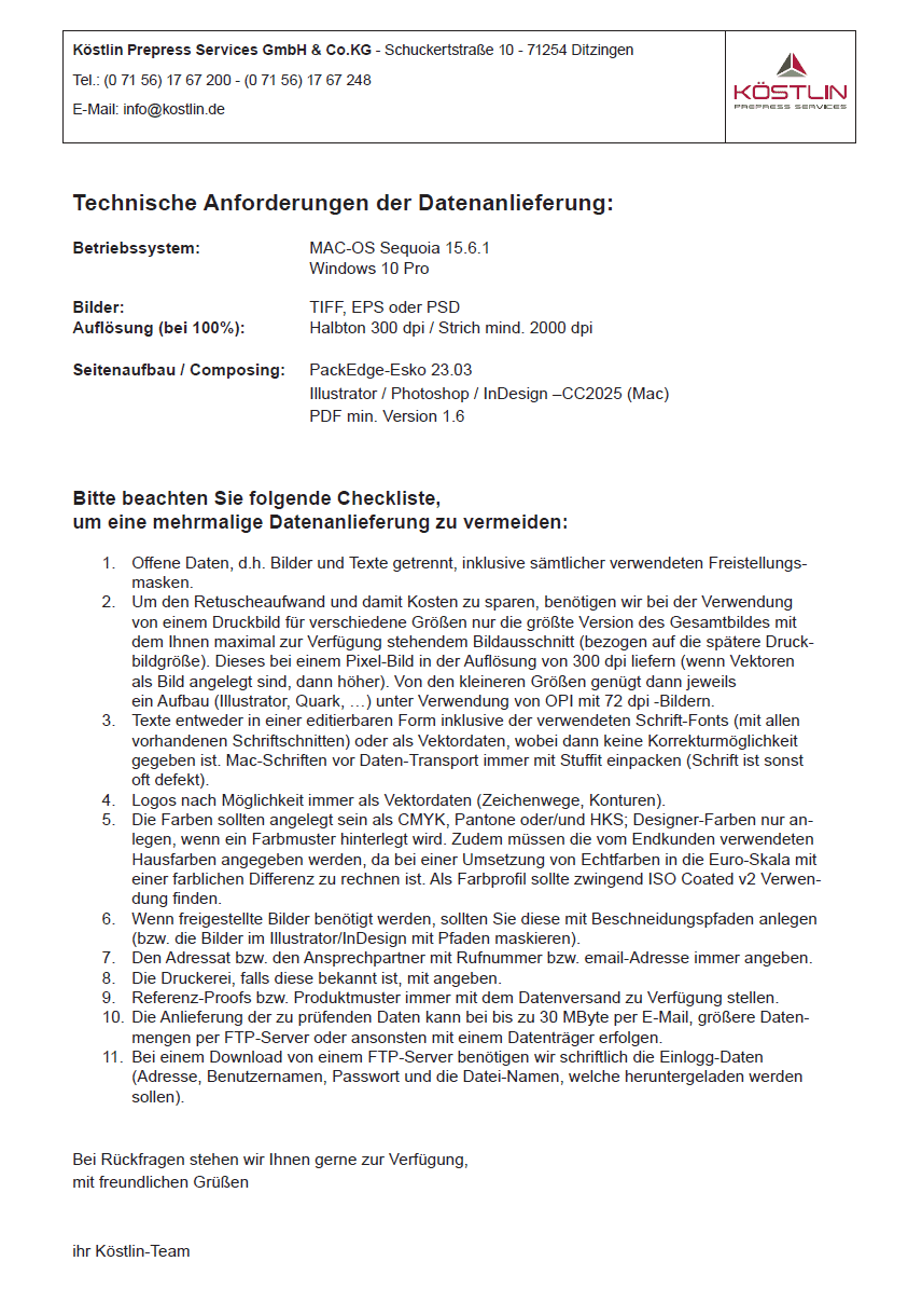 Die Datenprüfung ist der erste Step der durchgeführt wird, wenn ein neuer Auftrag bei Köstlin platziert wird. Damit wir mit diesen Daten arbeiten können, werden diese geprüft. Es gibt verschiedene Kriterien die erfüllt sein müssen.